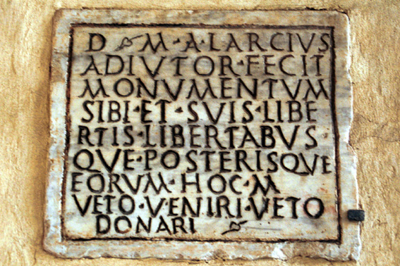 D(is) ❦ M(anibus) · A(ulus) · LARCIVS / ADIVTOR · FECIT / MONVMENTVM / SIBI · ET · SVIS · LIBE / RTIS · LIBERTABVS / QVE · POSTERISQVE / EORVM · HOC · M(onumentum) / VETO · VENIRI · VETO / DONARI ❦