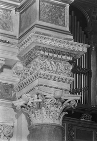 Kolonády nesou kladí skládající se z architrávu, vlysu a římsy, kde architráv byl sestaven z opakovaně použitých obdélníkových bloků několika typů mramoru, přičemž každý blok pokrýval jedno intercolumnium mezisloupoví (asi 3,2 m měřeno od středu. Vlys byl v devatenáctém století opatřen nátěrem. Je zřejmé, že ne všechny artefakty pocházely z Caracallových lázní. A další spolia to potvrzují. Mezi soudobými římskými kostely vyniká výzdoba, ornatus, kostela Santa Maria in Trastevere jak kvalitou, tak množstvím. Ten nejvýraznější příklad: 104 mramorových konzol, podpírajících římsu, jsou ve skutečnosti kousky 17 menších starobylých říms, které byly rozřezány. Nejjednodušší jsou jednoduché části říms s konkávními nebo konvexními profily, jiné obsahují akantové listy  Použití zdobeného mramoru na tomto místě je zbytečné a nemá obdobu v jiných kostelech této doby, kde byly použity jednoduché, prostě formované konzoly. Motiv okázalosti se zdá být nepopiratelný a stejný motiv je patrný i jinde, v bohatých starobylých rámech tří východních portálů, v podpěrách katedry a  před jeho výměnou v 19. století – i v dlažbě.