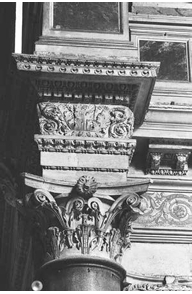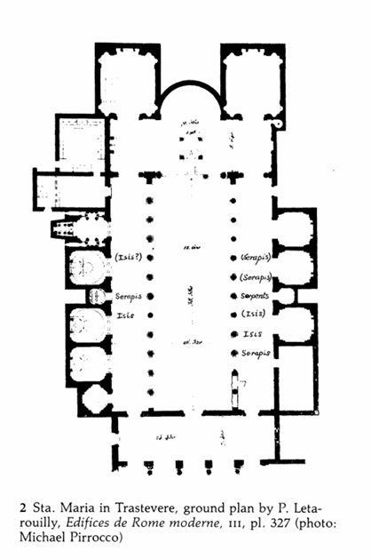 V jak velké míře se v Křesťanských stavbách využívaly prvky původních antických staveb, spolia, lze ukázat na bazilice Santa Maria in Trastevere, ze 4. století, která je jednou z nejstarších v Římě. První svatyně byla založena pravděpodobně mezi léty 221 až 227 papežem Callixtem I, (Kalixtem), pontifikát 217–222 [1], v minulosti byl ještě jako otrok pověřen vedením banky svým pánem Carpophorem. Na jeho příběh je link na konci článku. [2]