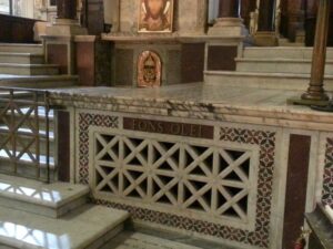 Označené místo v bazilice, kde podle tradicezázračně vyrazil pramen olivového oleje. Wikimedia Commons