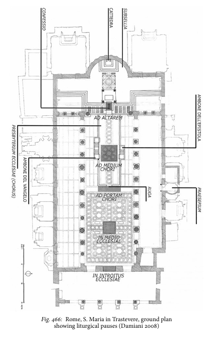 Umístění sloupů je v párech přes délku střední lodě a Damini tvrdí, že 3 spoliové dvojice tvoří významné body v papežské liturgii a jsou vyznačeny na obrázku. V 3. řadě tvoří dvojice ad medium Ecclesiae, u 6. páru porta chori, v 8. řadě ad medium chori.
