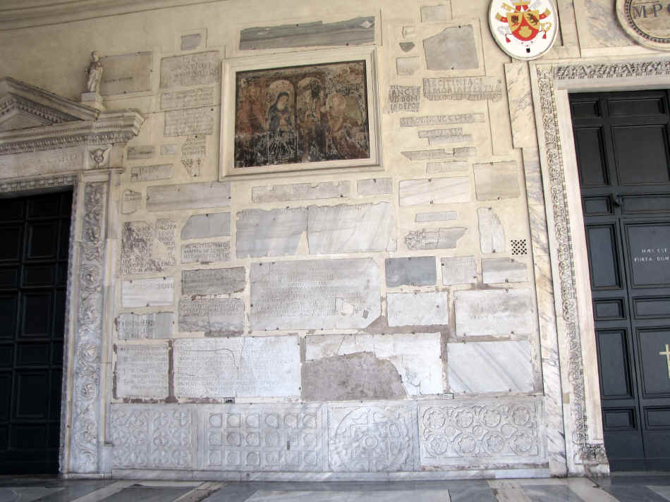 Stěny portiku jsou zaplněny spolii z pohanské i křesťanské doby. Wikimedia Commons