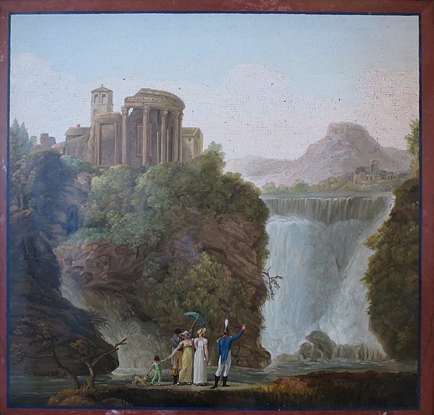Chrámy a vodopád na mikromozaice Giacoma Raffaelliho z roku 1817. Ermitáž