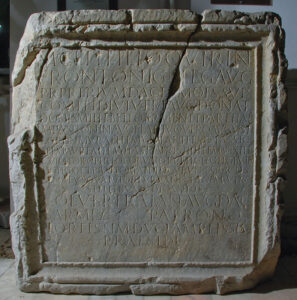 CIL 03, 01457 EDCS -26600893 od obyvatel Colonia Traiana Sarmizegetuza, „patron, nejodvážnější muž, nejštědřejší proprétor (praeside). Proprétor Dacie 168-170. Poprvé publikováno historikem Theodorem Mommsenem.