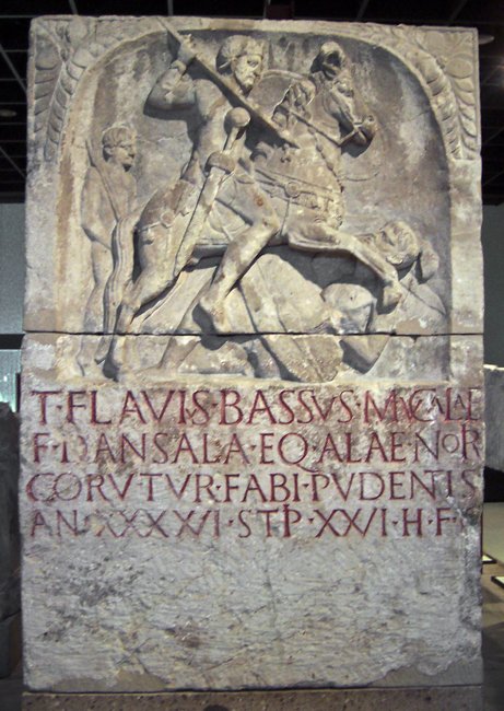 T(itus) FLAVIVS BASSVS MVCALAE / F(ilius) DANSALA EG(ues) ALAE NORI / CORU(m) TVR(ma) FABI PVDENTIS / AN(norum) XXXXVI STIP(endiorum) XXVI H(eres) F(aciendum) C(uravit).